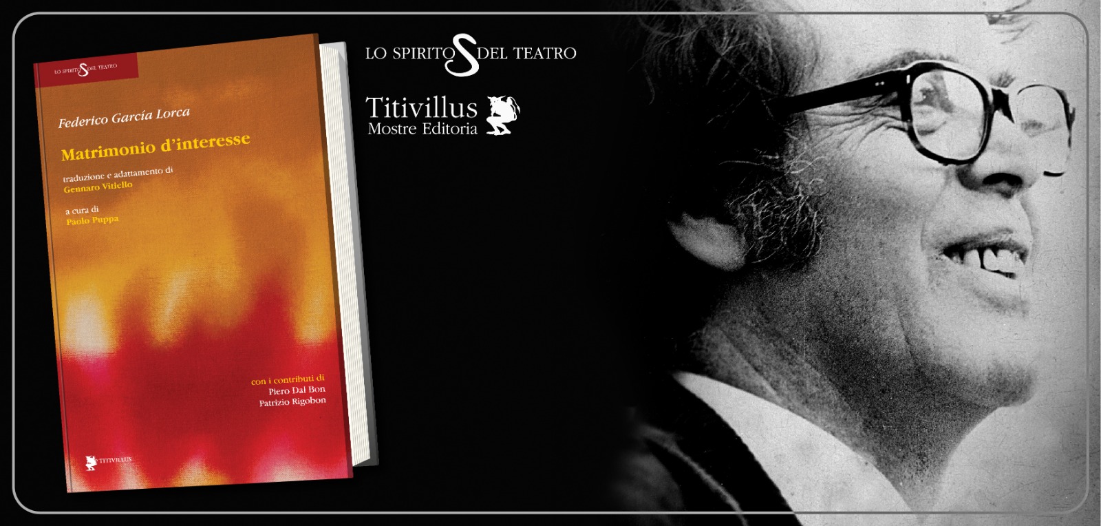 Nell’occasione sarà presentato l’ultimo libro edito Titivillus, della collana Lo Spirito del Teatro n. 102, Matrimonio d’interesse di Federico García Lorca, a cura di Paolo Puppa, traduzione e adattamento di Gennaro Vitiello, con i contributi di Piero Dal Bon, Patrizio Rigobon.